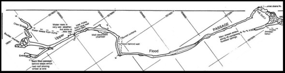 The streamway continues on as a fine straight rift. A climb over boulders (left hand side) bypasses a wet duck at stream level. The next section, the "Zig Zags", is a fine piece of stream passage with sharp left and right bends. The first right bend is marked by a deep pool but the streamway soon becomes shallow again and dropping to a crawl under straws. A low crawl passes a small muddy inlet on the right. This flows continuously but the water just wells up out of a muddy wallow. The second right bend is marked by a large piece flowstone, the "Duck Under Boss". Above the boss (taped off - no entry) is a small grotto leading to a low crawl which terminates at a chest deep gour. There is no way on beyond.