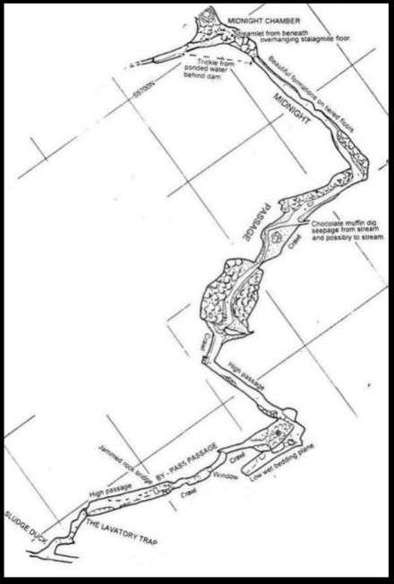 Downstream from the Sludge Duck T-junction the way on becomes a crawl along The Canal, enlarging at Puddle Lake where the Midnight Passage stream (Midnight Streamway) enters from the left. This passage has been pushed upstream back towards the slot seen before the climb up to By-Pass Passage but is too tight.