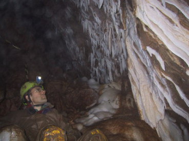 Shortly before the climb down, it is possible to climb up some 4 metres on the left side of the passage into "Halogen Loft" and traverse to enter the Oct 2006 discoveries. A short muddy section leads to a steep climb over dryer mud to an opening into "Royal Icing Chamber", where several large blocks are capped with pure white calcite.