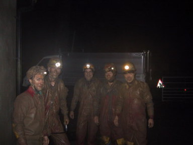 At around 400 metres, a climb on the right leads to "Charnel Inlet", and a rope climb to a mud filled passage. A desperate muddy squeeze has been dug to a mud blocakage. At the start "Charnel Inlet" in the floor on the left is a tight descending tube. A constriction after 8m has been passed to easier going beyond. This tight passage climbs quite steeply and the current end (June '07) is a tight flowstone rift. **Warning: poor air has been encountered here**.