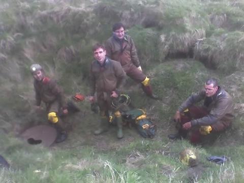 From the foot of the pipe a short passage leads to the head of a 6ft climb down to man-made steps. A back-filled pasage behind the steps originally led back towards the surface and timber roof shoring was seen.