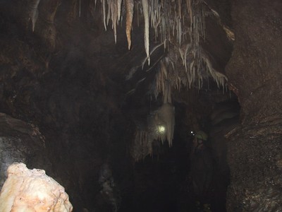 At around 250 metres from the boulder choke the stream passage opens out at a large chamber, "Walk the Plank" where a large flowstone cascade comes in from the right. A fixed handline (June 2007) allows access to the upper levels of the slope. A steep climb - keep to the right hand wall - reaches the small "Walk the Plank Inlet" at the very top. This wet and muddy inlet has been pursued for 5m. A way can be seen but needs digging. Back across the chamber a large passage can be seen heading off downslope (taped off - no entry). This flyover runs for 60m but is blocked.