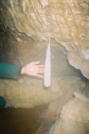 "Neverland" contains the best formations in the currently known cave, perhaps some of the best in the UK. Now that a link to Neverland from West pasage has been opened, the original way in from the top of the descent to West Passage is no longer used.