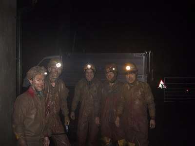 The crawl arrives at hole, at the bottom of which is what appears to be a perched sump, "Chuckle Sump". This has been bailed to a mud and rocks blockage but quickly refills after wet weather. A stream can be heard through the rocks just above the sump; this is "Chuckle Choke". Traversing past the hole leads into "West Passage", which continues in an almost straight line (with the exception of a single left-right joggle) for around 150 metres. The passage contains some nice gour dams, and some extremely liquid mud. At the end, the passage turns sharp left and terminates a few metres on, but a low arch to the right gives access to "West End Chamber".